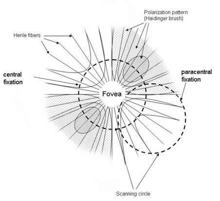 DISCUSSION: Because during central fixation the 3º scanning circle crosses the two maxima and two minima areas of the polarization cross, which are approximately 1.5º of visual angle from the center of the fovea (Figure 1), our technology is able to detect foveal fixation with an accuracy of at least ±1º. This has been shown in an earlier study using a 2-D eccentric viewing scale, graduated in degrees of visual angle and reflected into the light path of the fixation detector, centered on the central fixation point. 11 With the present instrument, as shown in Figure 4a,b, deviation of 1.5º from central fixation causes a drop in the RP ratio readily detectable by the system.