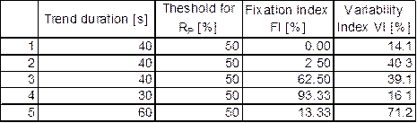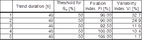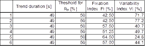 Table 5 shows FI and VI of an ADHD patient and a control subject, with both protocols (with or without a movie) applied on each one of them. It can be seen that the influence of the protocol is minimal both in FI and VI, whose average values do not change much with the protocol. A two-tailed t-test was applied to compare the measurement array for protocol (a) (without movie) to the array for protocol (b) (with movie), for each subject and for each parameter (FI and VI). The t-test probability that the two arrays are samples from populations with the same mean are high for all four pairs of arrays compared, respectively 0.97 and 1.00 for FI, and 0.89 and 0.83 for the FI. Despite the limited number of patients and the limited number of recordings, this simple assessment indicates that the way of presenting the target and the distraction element might not play an important role. This needs to be tested more rigorously in a future study.