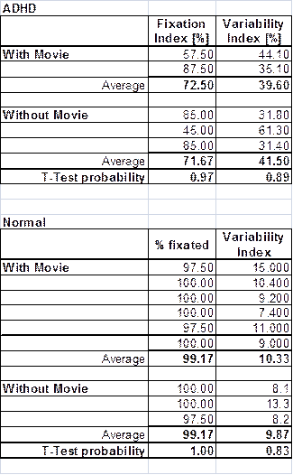 Table 5. Fixation results for an ADHD patient compared with those from a normal control in the presence and absence of video. The t-test shows little difference between the traces recorded with and without a movie for each of the subjects.