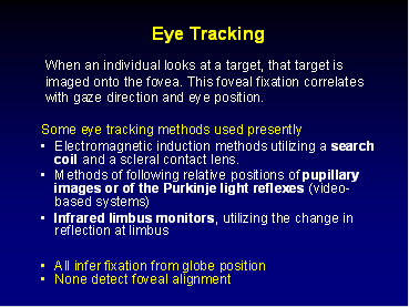 The major advantage of this eye-tracking method is that it uses true information coming from the fovea, rather than reflections from other structures, to identify the direction of foveal gaze. We believe that a sensor based on true foveal fixation, despite all the difficulties described in this article, would be superior to common commercial eye-trackers employing the corneal light reflex and/or pupil information. Other currently used methods are either invasive, restrict head movement strongly, or provide output referenced to head coordinates only. In most studies of eye position, it is the projection of the fovea onto the environment (fixation) that is of interest. Our method can detect true foveal position. Most other techniques measure the orientation of the globe (eye position), requiring a calibration step to avoid discrepancy between inferred and true foveal fixation in certain eye conditions (e.g. eccentric pupil). The present measuring principle, although requiring calibration too, is based on auto-conjugacy of the retina with the light source and with the detector and permits relatively free movement of the head. 19