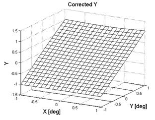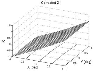For the linear solution applied to different points on the field studied, it can be seen on the plots for X [Fig.6(a)] that the x-function increases monotonously from left to right, although this rise is not the same for different values of Y. Similarly, the plots for Y [Fig.6(b)] show a function generally proportional to the y-coordinate, but the rate of increase depends on the x-position. Although the functions for X and Y are monotonous, linearity exists only in the central region and deteriorates toward the corners of the field studied. The linear error for X can be as high as 0.7º which is 35% of the field size, and the error for Y can reach 0.5º, equivalent to 25% of the field size in the border areas. Such precision may be good only for very unchallenging applications (like actuating of big visual “buttons”), but is obviously insufficient for more demanding tasks. The correction matrices COR_X [Fig. 7(a)] and COR_Y [Fig. 7(b)] improve precision considerably, resulting ultimately, as with the model, in very good linear behavior of both X and Y [Fig.8 (a,b)]. The absolute error after matrix-based correction amounts to less than 0.09º for X and less than 0.05º for Y , which are 4.5% and 2.5% of the size of the whole field, respectively.