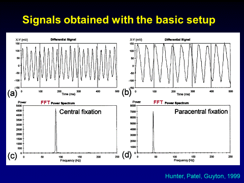 Polarized near-infrared light is reflected from the foveal area in a bow-tie pattern of polarization states; the pattern is similar to the faint pattern observed surrounding the point of fixation when a subject views a clear background through a polarized filter (the Haidinger brush phenomenon 6). With our previous instruments, the foveal area was probed with a circular scan of frequency f . When the eye fixated on a point at the center of the circular scan, the double-pass polarization state of the light changed at twice the frequency of the scan (2f). With paracentral fixation, the change in the polarization state was only at the frequency of the scan (f).